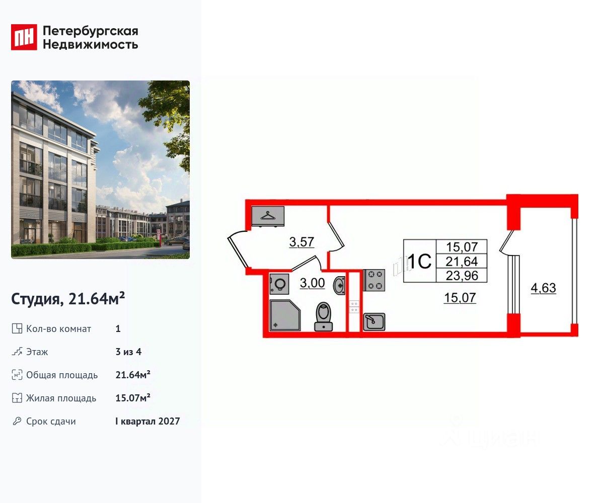 Удобная, классическая, функциональная европланировка, просторная прихожая 3.57 м². Общая площадь студии - 21.64 м², жилая 15.07 м², высота потолка 3 м.