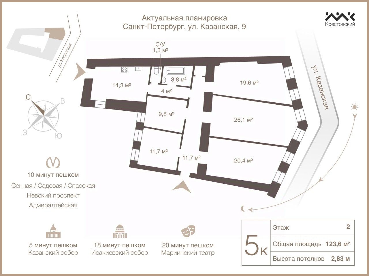 Казанская улица — престижный адрес в самом центре города с непосредственной близостью к Казанскому собору и Невскому проспекту. Культурные достопримечательности и знаковые места эту локацию особенно привлекательной.