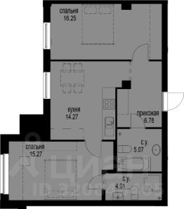 Планировка удобная и функциональная: вместительная прихожая с местом под гардеробный шкаф для хранения вещей, светлая кухня-гостиная, две просторные спальные комнаты и два санузла.