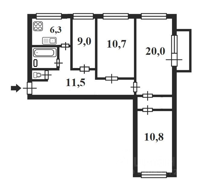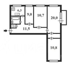 Комнаты смежно-изолированы (20+10,8)+10,7+9 кв.м. Большой вместительный коридор. Не застекленный балкон. Кухня 6,3 кв.м (кухонный гарнитур остаётся в подарок Покупателю).