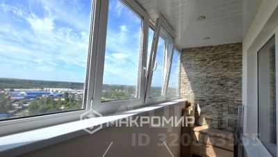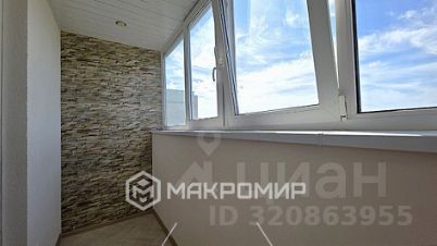 Большая утеплённая лоджия с двойным стеклопакетом, розеткой и отделкой декоративным камнем. На полу — практичная плитка.