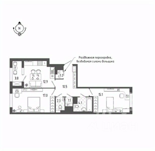 - Комната 17,0+15,1 м2
