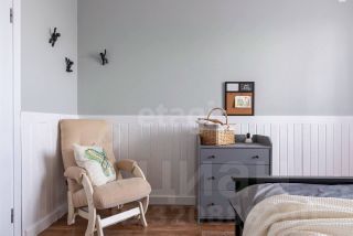 В жилых комнатах — спокойная пастельная палитра, удобное кресло-качалка, вместительный комод и декоративные акценты, создающие атмосферу уюта и гармонии.