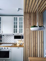 Кухня — настоящая мечта для тех, кто любит готовить и собирать гостей: функциональный гарнитур с деревянной столешницей, варочная поверхность, духовой шкаф, вместительные шкафы, уютная обеденная зона у окна с видом на город.