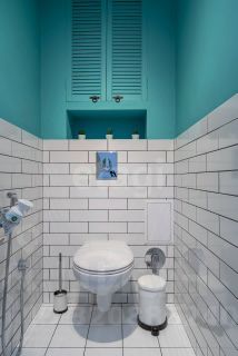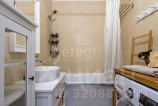 Санузел оформлен в свежей бирюзово-белой гамме с удобной планировкой и встроенными шкафчиками для хранения. Ванная комната в бежевых тонах располагает большой ванной, современной сантехникой и местом для стиральной машины с рабочей поверхностью.