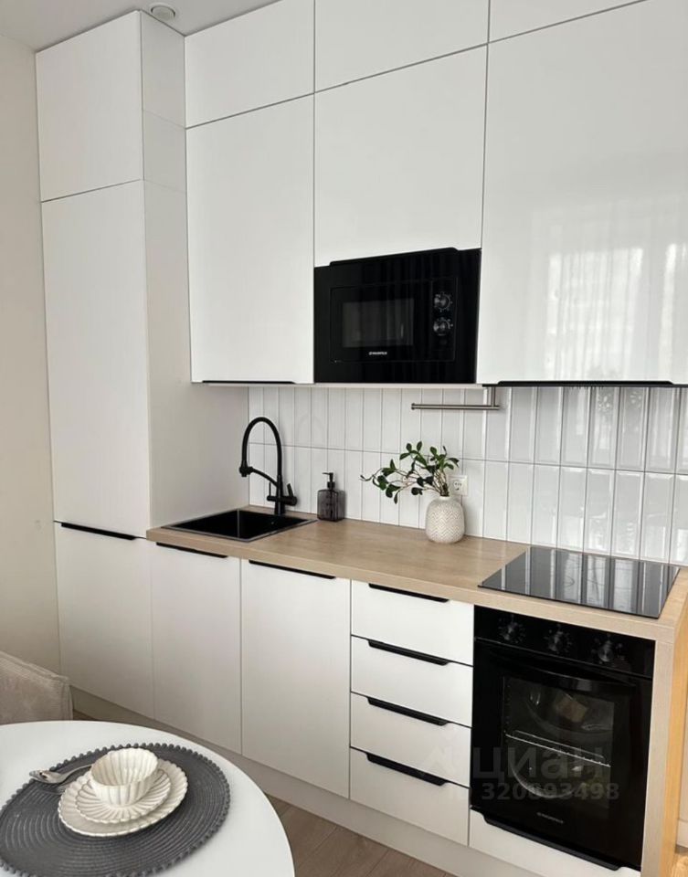 • На кухне установлена встраиваемая техника: индукционная варочная поверхность, духовой шкаф, микроволновая печь, холодильник, посудомоечная машина, а также мощная вытяжка.