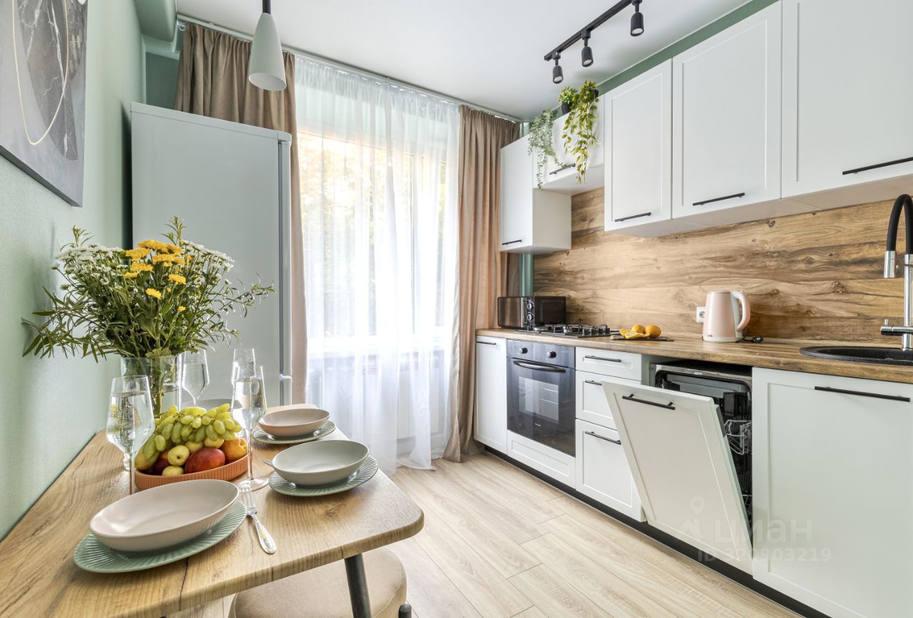 Кухня полностью укомплектована качественной мебелью и техникой: посудомоечная машинка, холодильник, духовой шкаф, варочная поверхность.