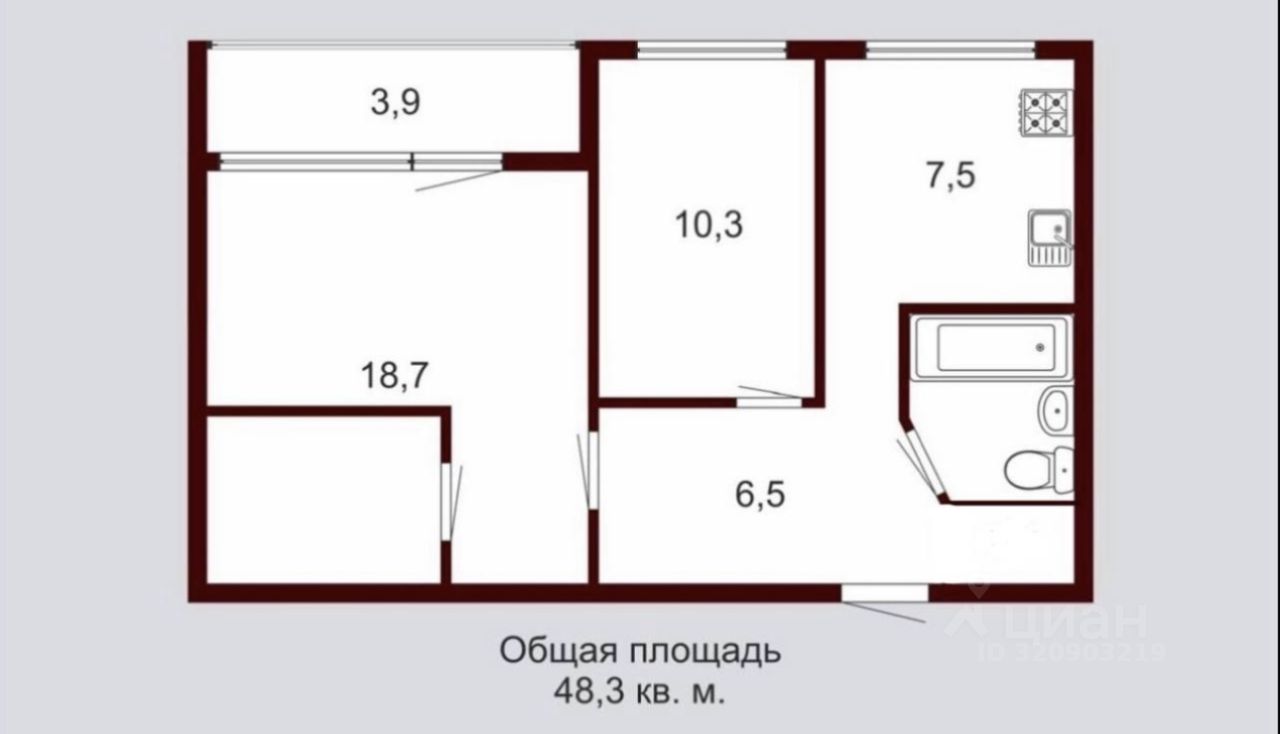 Общая площадь: 48,3 кв.м. Кухня: 7,5 кв.м. Изолированные комнаты 18,8 кв.м. и 10,2кв.м. Спальня легко трансформируется в детскую или кабинет- по вашему усмотрению.