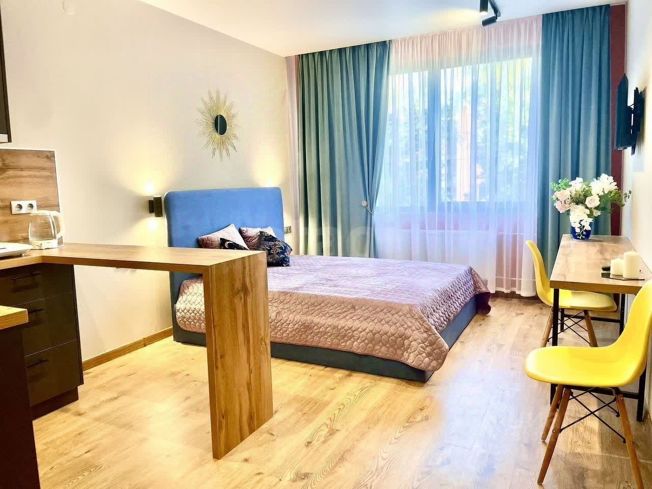 * Характеристики: Студия 25 кв.м с дизайнерским ремонтом, светлая и теплая. Высота потолков 2.8 м.