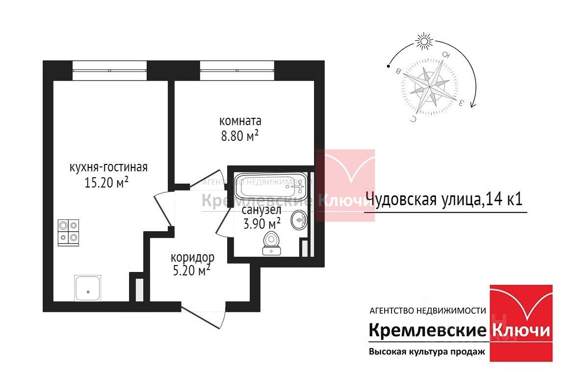 В квартире один совмещенный санузел, окна выходят на улицу.