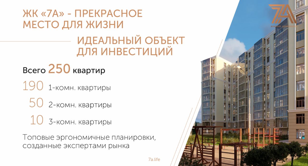 Над концепцией ЖК 7А работала команда экспертов рынка, с фокусом на создание проекта равно привлекательного как для жизни, так и для инвестиций.