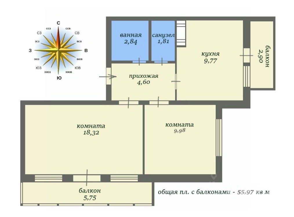 - Общaя площадь без учета двух балконов 45,8 кв м + два застекленных балкoна 5,75 кв м и 2,90 кв м. Квартира двухсторонняя. Куxня 9.8 кв м с балконом, что очень удобно, ведь как приятно утром выпить чашечку кофе, а вечером в прохладу поужинать в кругу близких людей. Одна комната площадью 9,98 кв м, вторая 16,32 кв м, расположена на южной стороне, с двумя окнами, широкой, 1 м, балконной дверью, которая выводит вас на большой застекленный балкон 5,75 кв м. Квартира с черновой отделкой, что позволит вам реализовать ваши дизайнерские идеи.