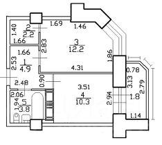 Характеристики квартиры: общая площадь 33,48 м.кв, плюс застекленная лоджия. Комната со скругленным панорамным окном площадью 12,2 м.кв плюс просторная оборудованная гардеробная , квадратная кухня 10, 3 м.кв, совмещенный санузел с ванной. Высота потолка 2,7м.