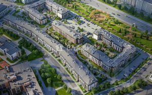Архитектура жилого комплекса — современное прочтение классических традиций Петербурга. "Дворцовый фасад" раскрыт к проспекту Буденного широким парадным двором. Симметричная композиция фасадов дополнена выступающими элементами и напоминает центральный портик Константиновского дворца. Высота домов — всего 4 этажа.