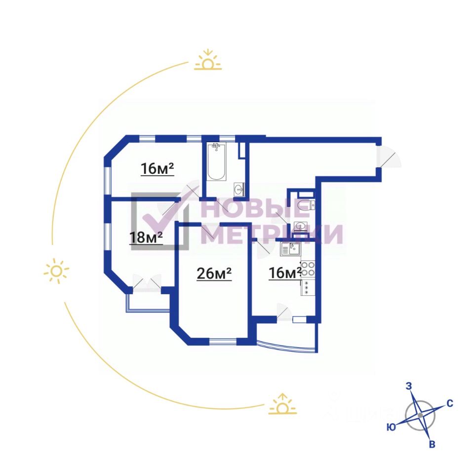 - Три изолированные комнаты: 26 м², 18 м², 16 м².
