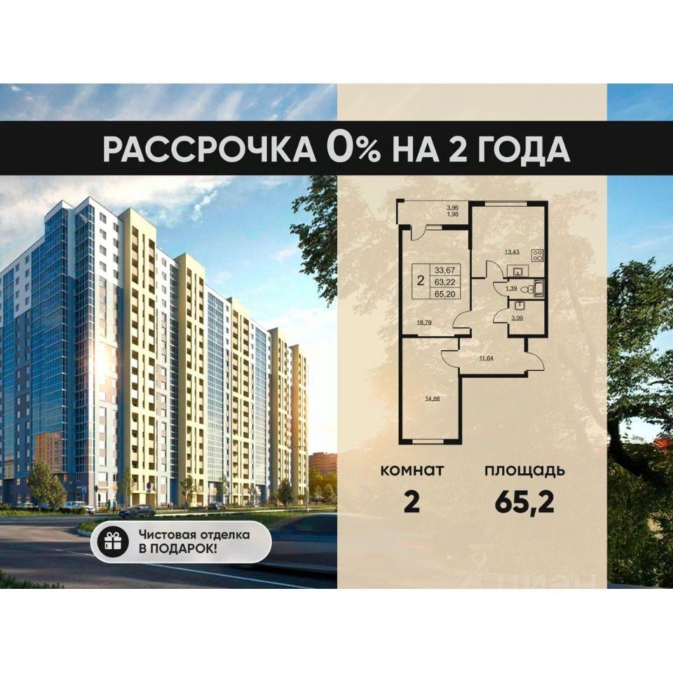 Прямая продажа от застройщика. Чистовая отделка в подарок! Будьте выше. ЖК "Высота" — это современный 18-этажный дом, предлагающий новый уровень комфортной жизни. Проект воплощает концепцию "всё необходимое в шаговой доступности": встроенный детский сад, расположенный прямо в комплексе, для максимального удобства родителей, магазины, аптеки и кафе. А для активного отдыха и спорта на территории комплекса предусмотрена баскетбольная площадка, которая зимой превращается в уютный каток. ЖК "Высота" — это больше, чем просто квартира, это новый, более высокий уровень жизни. Квартиры: ЖК "Высота" предлагает широкий выбор квартир и планировок: от функциональных студий до просторных двухкомнатных. Площадь квартир — от 24,74 м² до 79,44 м². Каждая квартира сдаётся с полной чистовой отделкой, позволяющей сразу начать обустройство без лишних затрат времени и средств на ремонт. Для дополнительного удобства жителей на цокольном этаже предусмотрены индивидуальные кладовые для хранения сезонных вещей и спортивного инвентаря. Транспортная доступность и расположение: ЖК "Высота" расположен в экологически чистом, активно развивающемся посёлке Бугры, недалеко от зон отдыха: "Охта-Парк", "Игора", "Северный склон" и конноспортивный клуб "Дерби". Комплекс может похвастаться отличной транспортной доступностью: 15 минут до станции метро "Девяткино", обеспечивающей быструю связь с центром Санкт-Петербурга и другими районами. В 20 минутах езды находятся станции метро "Гражданский проспект" и "Проспект Просвещения", до КАД — всего 10 минут. Благоустройство дворов: Дворы жилого комплекса "Высота" — продуманное пространство для отдыха и активного времяпрепровождения жителей всех возрастов. Для самых маленьких здесь оборудованы безопасные площадки с мягким резиновым покрытием, песочницами и невысокими горками. Дети постарше оценят игровые комплексы с качелями, каруселями и зонами для активных игр. Уютные зоны отдыха с удобными скамейками, расположенными в тени деревьев, позволят насладиться тишиной и свежим воздухом. Продуманная система велодорожек и тротуаров обеспечивает комфортное и безопасное передвижение по всей территории комплекса. Особое внимание уделено доступности для маломобильных групп населения. Инфраструктура: Здесь созданы все условия для активного образа жизни. Для взрослых жителей оборудована спортивная площадка для занятий воркаутом и баскетболом. Зимой на её месте заливается каток. Для маленьких жителей предусмотрен большой встроенный детский сад с собственной игровой площадкой и отдельным безопасным входом. Удобство добавляют велопарковки, расположенные у парадных и во дворе, а также отдельные входы на автостоянки. Ключевые преимущества и особенности ЖК "Высота": Собственный детский сад с игровой площадкой — забота о будущем поколении. Близость к метро — экономия времени и сил. Развитая инфраструктура — всё необходимое под рукой. Каток и баскетбольное площадка — здоровье и активный образ жизни. Разнообразные планировки — квартира вашей мечты