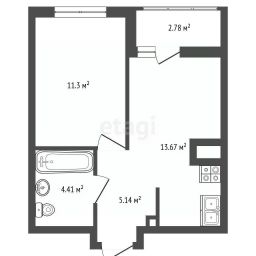 Эргономичная планировка общей площадью — 31 кв. м, кухня — 13 кв. м, комната - 11 кв.м, санузел совмещенный, застекленная лоджия
