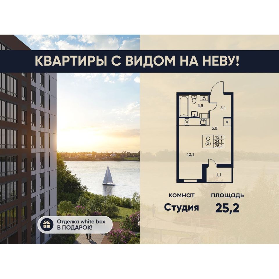 Прямая продажа от застройщика. Отделка White box в подарок! ЖК "Ермак" современный жилой комплекс комфорт-класса на первой береговой линии Невы, рядом с Невским лесопарком. Из большинства квартир (90%) открываются захватывающие панорамные виды на реку. Комплекс спроектирован с учетом современных требований безопасности, технологичности и качества материалов. Во дворе жильцов ждет настоящий сад с разнообразными зонами отдыха для всей семьи и площадкой для выгула собак. А для автовладельцев предусмотрены 436 машино-мест на закрытой парковке. Кроме того, в комплексе расположено 20 коммерческих помещений. Квартиры: Трёхкомнатные квартиры ЖК "Ермак" обладают наилучшими видовыми характеристиками — из их окон открывается великолепный вид на Неву и набережную. Комплекс предлагает широкий выбор планировочных решений — от компактных студий (от 25,2 кв.м) до просторных трёхкомнатных квартир (до 69,9 кв.м). Удобные планировки, в том числе евроформата с объединенной кухней-гостиной, позволяют максимально эффективно использовать пространство. Квартиры сдаются с предчистовой отделкой White Box, что предоставляет будущим жильцам свободу в реализации своих дизайнерских идей. Важное преимущество подобной отделки отсутствие шумных и "грязных" работ при заселении. Инфраструктура: Во дворе жилого комплекса раскинулся настоящий зелёный оазис с разнообразными растениями — идеальное место для отдыха после пробежки или тренировки на специально оборудованных спортивных площадках. В шаговой доступности находятся Невский лесопарк и благоустроенная набережная Невы с чистой водой. Это живописное место напротив устья реки Ижоры имеет историческое значение: именно здесь князь Александр Невский разгромил шведов. А для автовладельцев предусмотрена наземная парковка по периметру квартала. Благоустройство дворов: Природа здесь не просто гость, а полноправный житель. Почти половина территории комплекса отведена под благоустройство. Тщательно подобранные деревья, цветы и кустарники создают неповторимый ландшафт, радующий глаз не меньше, чем вид на реку. Живые изгороди гармонично разделяют детские и спортивные площадки, уютные скамейки и беседки, изумрудные газоны и современные малые архитектурные формы. Для комфорта каждого члена семьи предусмотрены также площадка для выгула собак. Транспортная доступность: Близость к КАД: 7 км до КАД (8 минут на автомобиле). Метро: 20 минут езды на транспорте до станции метро "Ломоносовская". Остановки общественного транспорта рядом с комплексом. Продуманные парадные: Входные группы спроектированы для максимального комфорта жителей и их гостей, как внутри, так и снаружи. Больше свободного места в квартирах! Для хранения колясок, велосипедов и самокатов предусмотрены просторные помещения в каждой парадной. Ключевые преимущества и особенности: Близость к природе: Невский лесопарк и набережная Невы рядом с домом. Зоны отдыха для всей семьи и площадка для выгула собак. Парковка Концепция "двор без машин". Разнообразие планировок кварт