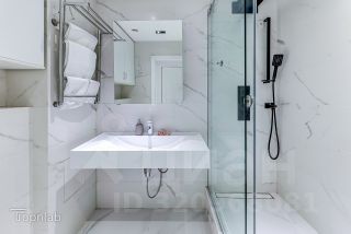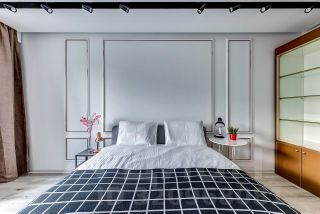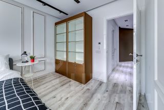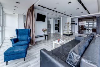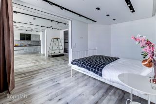 Одна из комнат изолируется с помощью дизайнерского решения - светонепроницаемые шторы. По периметру квартиры встроенная потолочная система освещения.