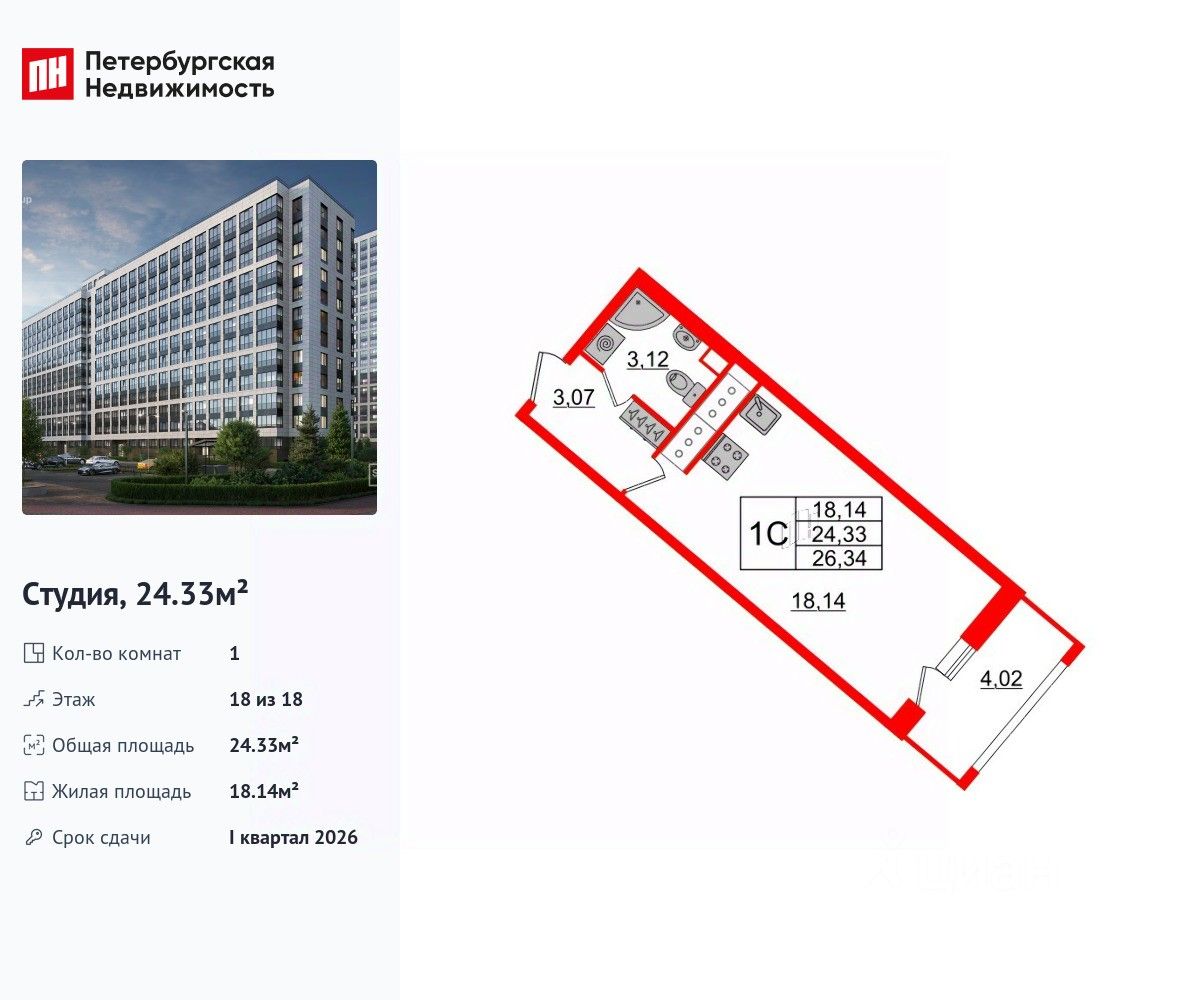Удобная, классическая, функциональная европланировка, вместительная прихожая 3.07 м². Общая площадь студии - 24.33 м², жилая 18.14 м², высота потолка 3.11 м.