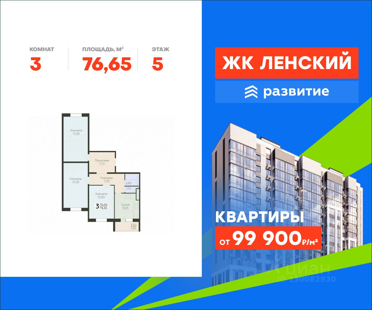 В продаже квартира площадью 76.65 кв. м без отделки на 5 этаже 16 этажного дома. Квартира находится в 4835 корпусе.