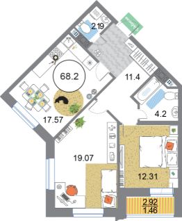 Продаётся 2 комнатная квартира в жилищном комплексе Modum (Корпус 3 секция 13). Общая площадь 68.2 кв. м, площадь комнат 12.31+19.07 кв.м. 2 санузла. Квартира расположена на 8 этаже 12 этажного дома. Сдается с отделкой White-box.
