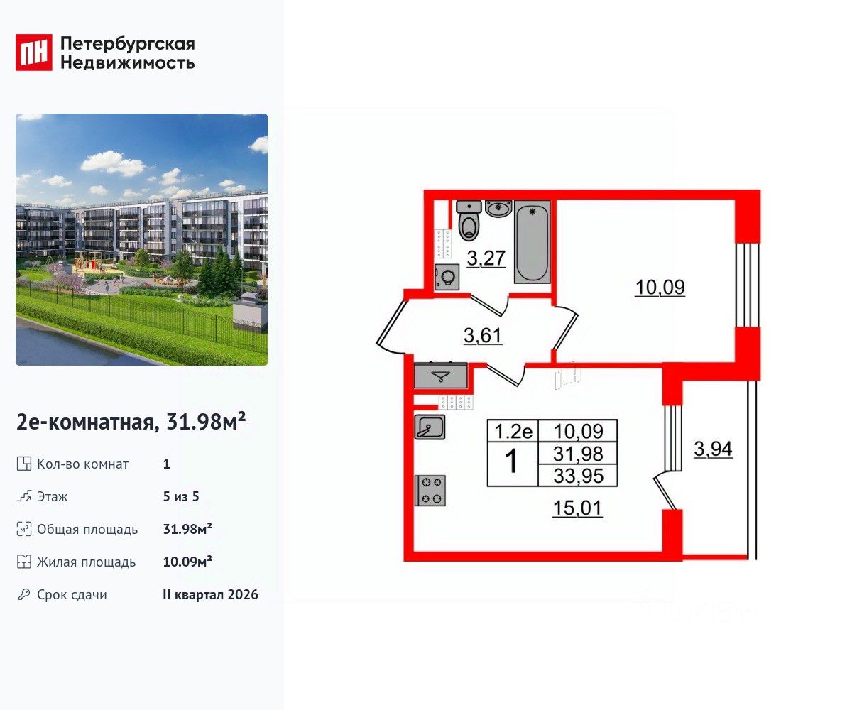 Удобная, классическая, функциональная европланировка, большая кухня-гостиная 15.01 м², вместительная прихожая 3.61 м². Общая площадь квартиры - 31.98 м², жилая 10.09 м², высота потолка 3.07 м.