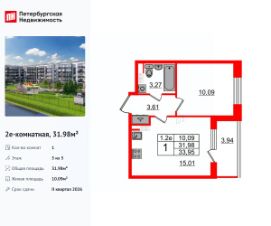 Удобная, классическая, функциональная европланировка, большая кухня-гостиная 15.01 м², вместительная прихожая 3.61 м². Общая площадь квартиры - 31.98 м², жилая 10.09 м², высота потолка 3.07 м.