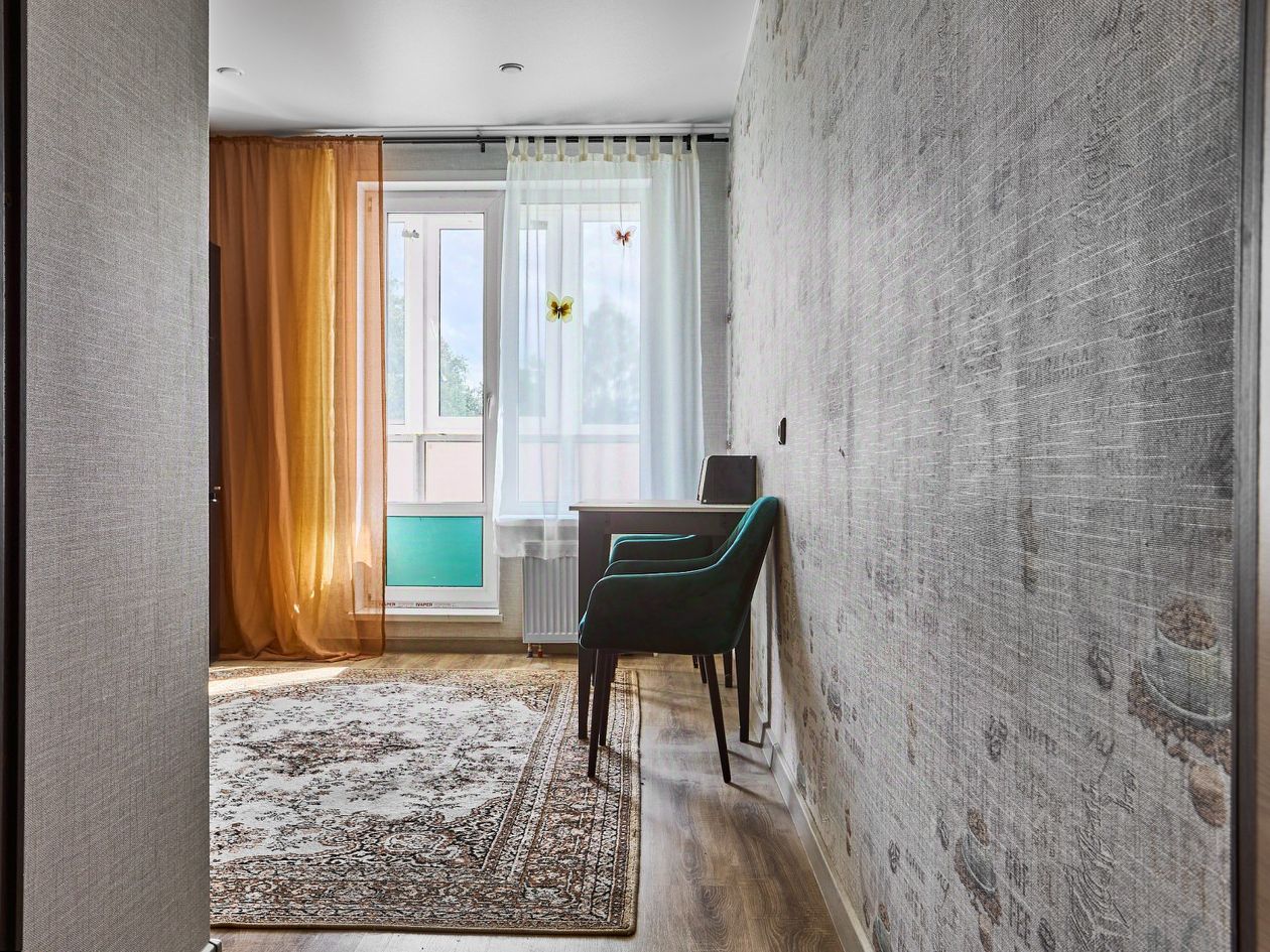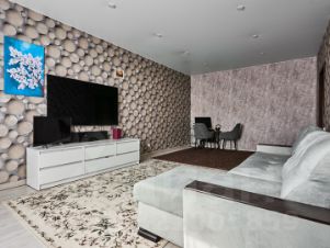 В квартире выполнен евроремонт: на полу ламинат, в санузлах плитка, обои, стеклопакеты, металлическая входная дверь.