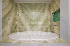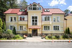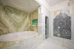 Интерьер оформлен с использованием художественного паркета, мозаики, витражей, лепнины, ценных пород дерева и камня. Установлены система "Умный дом", акустическая проводка, подсветка с 16 сценариями, заложен телевизор в зону джакузи. В санузлах использованы Vellеlungа Ceramica и редкий зеленый оникс. Выполнена акустическая и инженерная подготовка, добавлена мощность электроэнергии 45,5 кВт, смонтирована собственная котельная Viessmann.