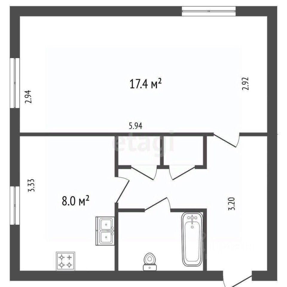 Общая площадь 36 кв. м грамотно распределена: просторная кухня 8 кв. м и изолированная жилая комната 17 кв. м.