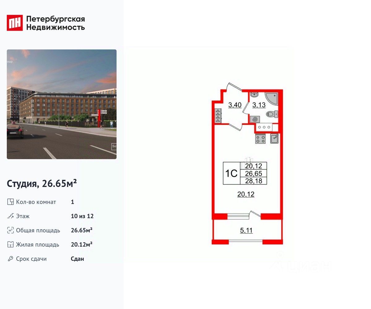 Удобная, классическая, функциональная европланировка, просторная прихожая 3.4 м². Общая площадь студии - 26.65 м², жилая 20.12 м², высота потолка 2.76 м.