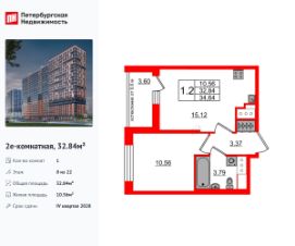 Удобная, классическая, функциональная европланировка, большая кухня-гостиная 15.12 м², вместительная прихожая 3.37 м². Общая площадь квартиры - 32.84 м², жилая 10.56 м², высота потолка 2.77 м.
