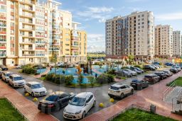 - Во дворе расположены детские и спортивные площадки, теннисный корт и стадионы.