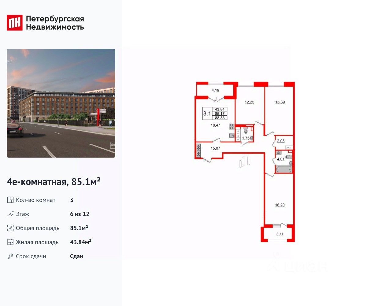 Удобная, классическая, функциональная европланировка, большая кухня-гостиная 18.47 м², просторная прихожая 15.07 м². Общая площадь квартиры - 85.1 м², жилая 43.84 м², высота потолка 2.76 м.