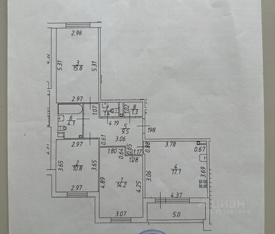 Квартира с одной из лучших планировок в ЖК. На этаже всего 4 квартиры. Окна выходят на две стороны. Практичная планировка кухня-гостиная (17,1 кв.м) с выходом на большой балкон 5,0 кв.м). Изолированные комнаты (15,8+14,2+10,8 кв. м). Раздельный сан.узел, в ванной комнате есть еще туалет, место для стиральной машины, теплый пол. Удобный коридор с нишей для шкафа или гардеробной.