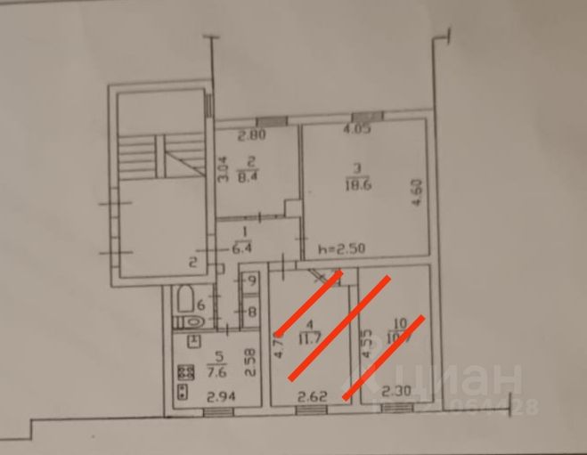 Смежные комнаты (11,4+10,7)кв.м в 4-х комнатной квартире площадью 67,3кв.м, с кухней 7,6 кв.м. Квартира расположена на 2-м этаже 2-х этажного кирпичного дома, 1953 года постройки, с железобетонными перекрытиями.
