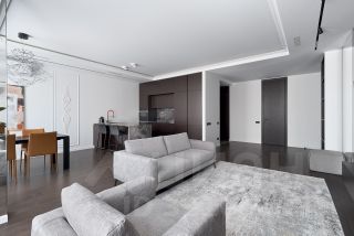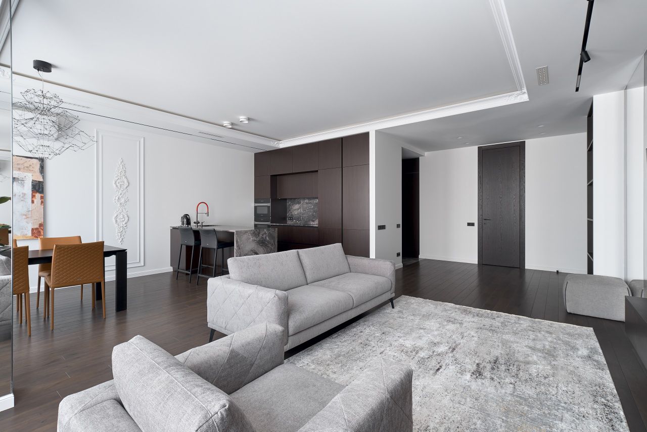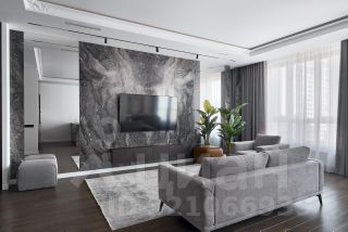 В отделке использованы натуральный мрамор (санузлы, душевая, прихожая, столешницы, подоконники, панно в гостиной), натуральный шпон (кухня, двери, встроенные шкафы), полы паркетная доска, итальянская мебель Natuzzi, свет Центрсвет + Bezhko. Гардеробные оснащены системой Elfa. Бытовая техника - Miele.