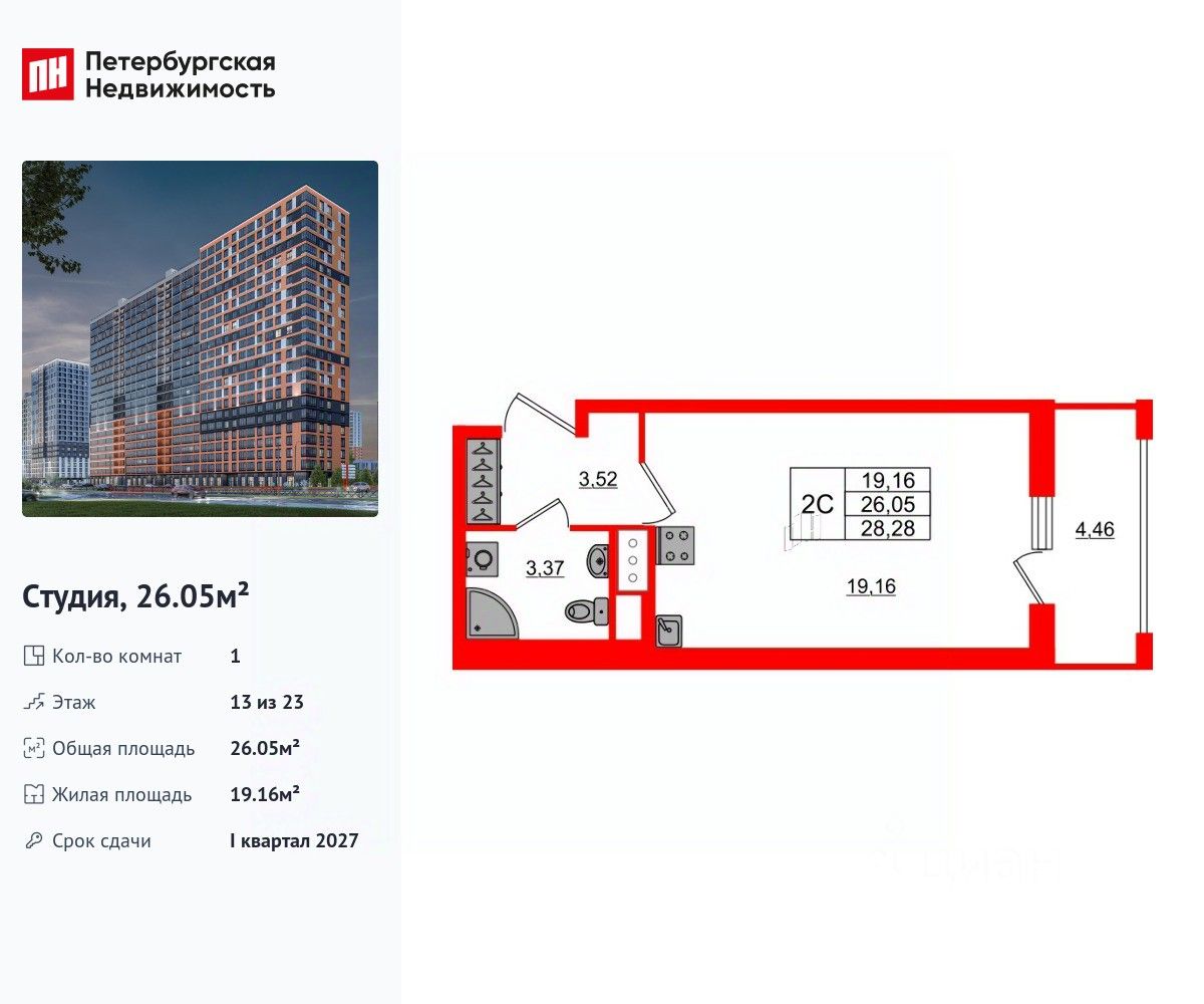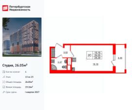 Удобная, классическая, функциональная европланировка, просторная прихожая 3.53 м². Общая площадь студии - 26.05 м², жилая 19.16 м², высота потолка 2.75 м.