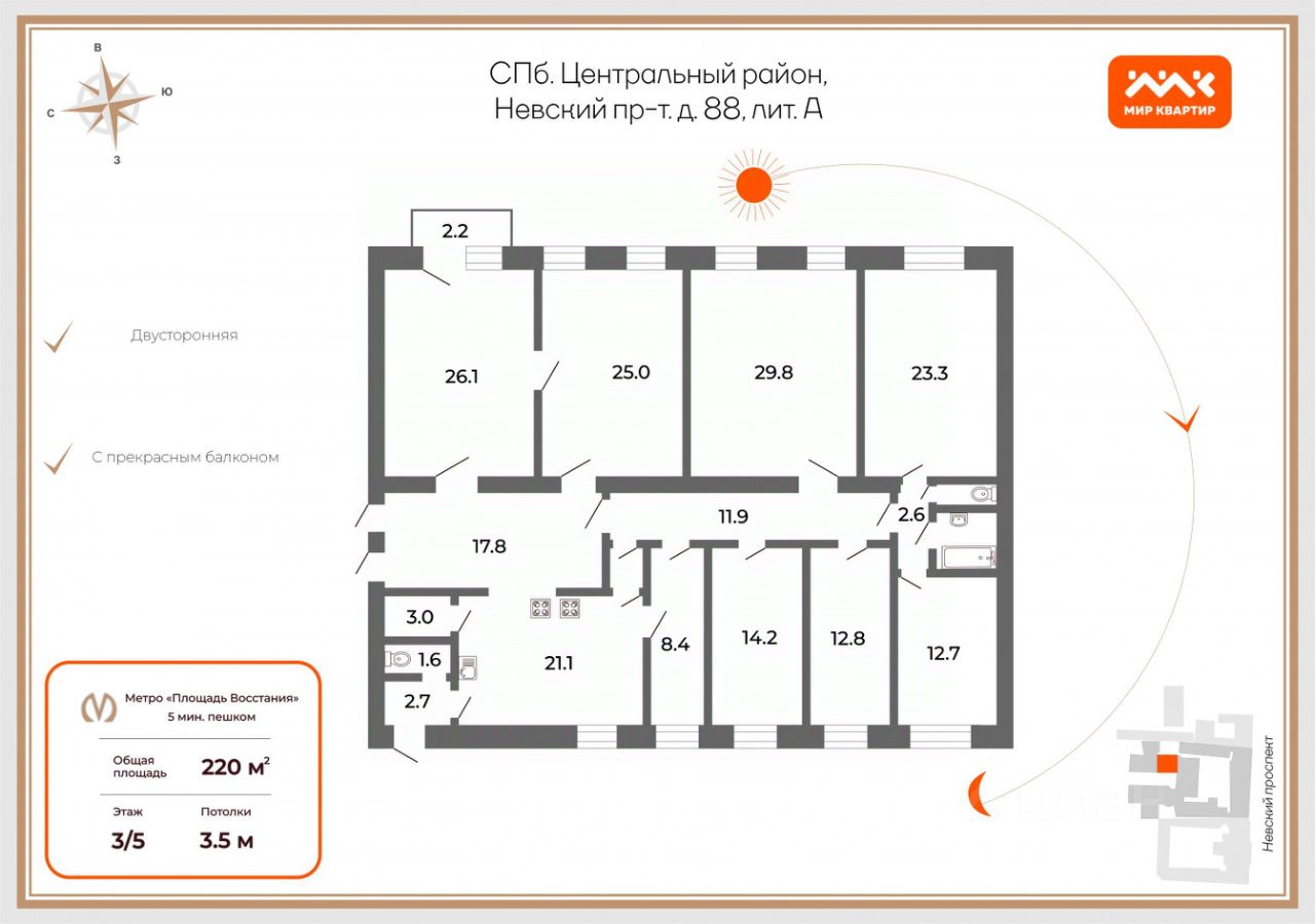 Красивый фасад дома воздвигнут в парадном дворе Невского проспекта, поэтому в квартире полная тишина.