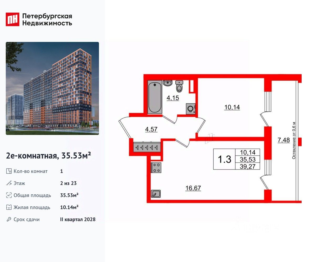 Удобная, классическая, функциональная европланировка, большая кухня-гостиная 16.67 м², просторная прихожая 4.57 м². Общая площадь квартиры - 35.53 м², жилая 10.14 м², высота потолка 2.77 м.
