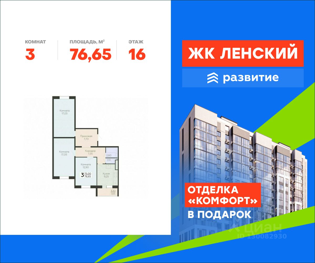 В продаже квартира площадью 76.65 кв. м с отделкой на 16 этаже 16 этажного дома. Квартира находится в 4835 корпусе: