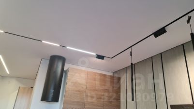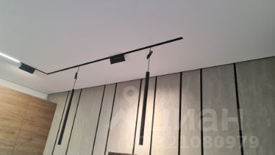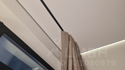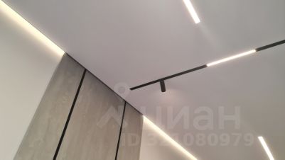 В квартире установлены тканевые немецкие потолки "JM Color Back" с теневым примыканием "EuroSlott" с магнитными трековыми LED светильниками, линейным освещением и встроенным карнизом от "Kraab Systems". В ванной полностью световой тканевый потолок "JM" с теневым примыканием "EuroSlott": светится все полотно натяжного потолка. В световой потолок интегрирован минималистичный теневой диффузор вентиляции 1500 мм от компании "Click Systems".