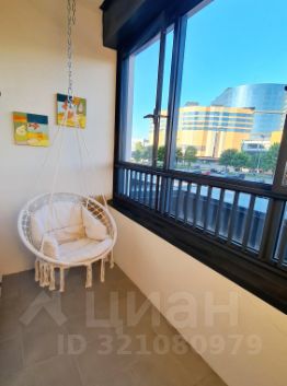 - Просторная лоджия с подвесными качелями и красивым видом на мегаполис.