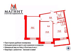 + Просторная удобная планировка: большая кухня и большие комнаты, широкий коридор, в котором размещается большая часть хранения.