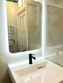 В ванной широкоформатный керамогранит, есть место для стиральной машины.