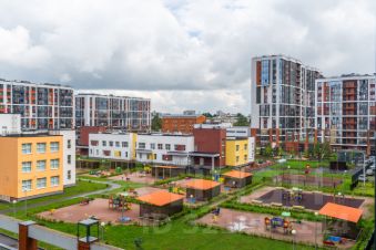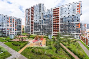 Монолитный дом 2021 года постройки с вентилируемыми фасадами.Парящие дворы на стилобатах, расположенные на уровне 2 этажа, оснащены детскими и спортивными площадками.