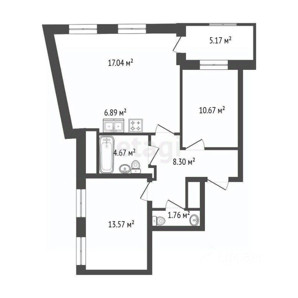 • 3 комнаты: жилая комната 10,67+17,04+13,57 кв.м., кухня ниша: 6,98 кв.м., санузел: совм. 4,67 + т. 1,76 кв.м., коридор 8,30 кв.м.