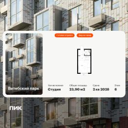 Продаётся квартира-студия площадью 23,9 кв.м на 6 этаже 12 этажного дома (Корпус 7, Секция 4) проекта ПИК Витебский парк. Светлый просторный подъезд на уровне земли, функциональная планировка, большие окна, c отделкой.