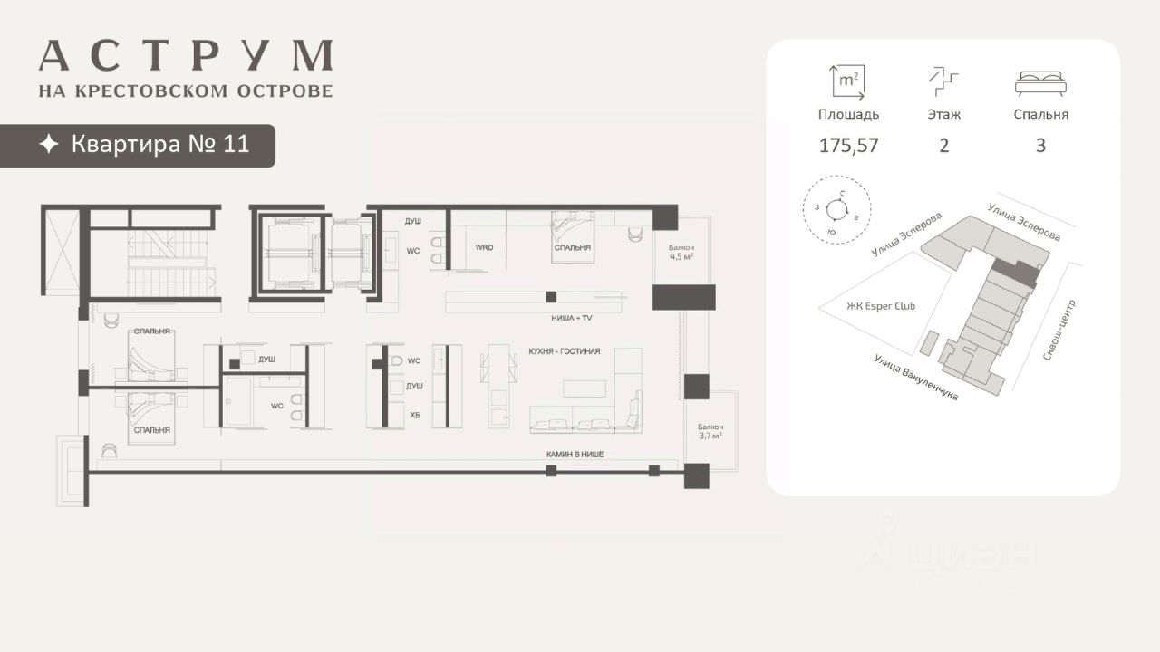 Квартира для семейного проживания площадью 175,57 кв. м расположена на 2 этаже и имеет детально продуманную планировку. Высокие потолки 3,15 м, панорамные окна в пол, два балкона, кухня-гостиная, 3 мастер-спальни, 4 ванные комнаты, выделенное хозяйственное помещение. Две детских спальни выходят в вечнозеленый внутренний двор. Предусмотрены индивидуальные системы кондиционирования и вентиляции, выделена увеличенная мощность электроснабжения. В подземном паркинге можно приобрести парковочное место. Один из самых статусных новых домов Санкт-Петербурга — Аструм, расположен в самой тихой части Крестовского острова, вдали от людей и машин, в шаге от набережной Средней Невки, Приморского парка Победы и парков на Елагином острове. Неподалеку разбит приятный для неспешных прогулок "Фруктовый сад" с яблонями, грушами, вишней и сиренью.